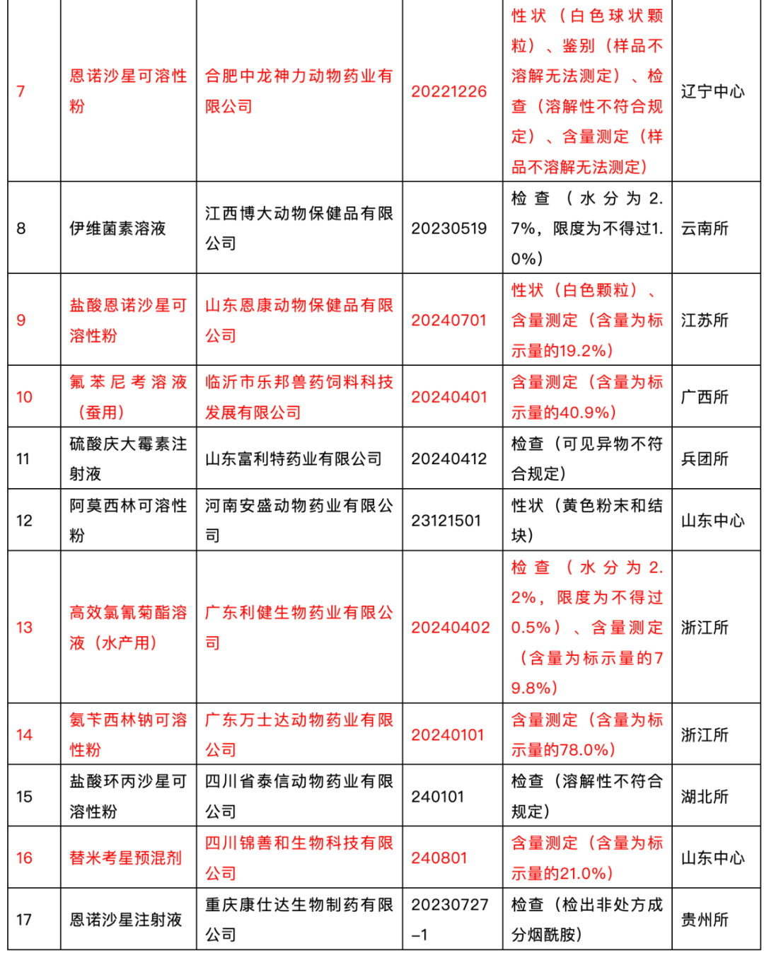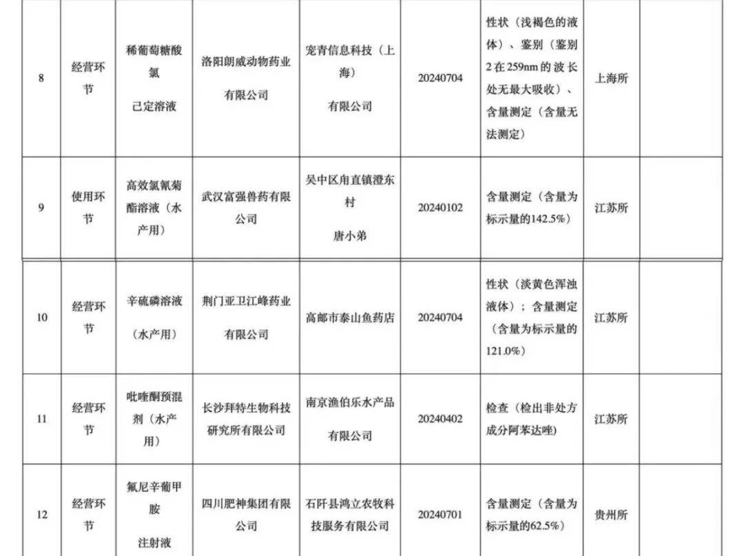 多家企业产物呈现含量不及格问题,包罗山东鲁宏动物药业无限公司的阿苯达唑伊维菌素预混剂和盐酸多西环素可溶性粉含量均不达标;山西省多家企业出产的水产用消毒剂含量不及格现象凸起;四川省多个企业的打针剂和预混剂含量严沉不脚。